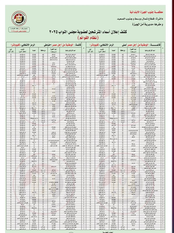 كشفت الهيئة الوطنية للانتخابات عن أسماء المرشحين النهائية ضمن "القائمة الوطنية من أجل مصر" لخوض انتخابات عضوية مجلس النواب لعام 2025 بنظام القوائم.