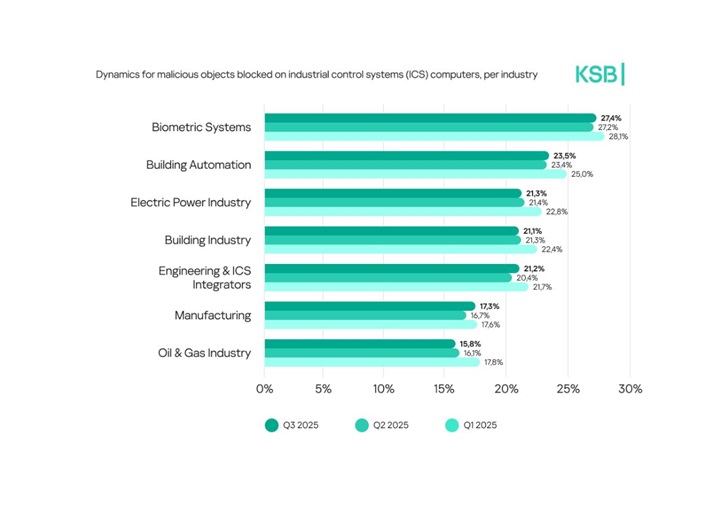 تعرضت بيئات العمل الصناعية إلى ضغوط متزايدة خلال عام 2025، وظهر ذلك في التعقيد المتنامي لديناميكيات التهديدات العالمية. فقد ظلت نسبة أجهزة التحكم الصناعية التي تعرضت إلى هجمات برمجيات خبيثة مرتفعةً، وذلك وفقاً لتقرير كاسبرسكي الأمني؛ إذ بلغت 21.9% خلال الربع الأول، ثم انخفضت إلى 20% بحلول الربع الثالث.