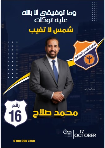 “رقمي (16).. صوتكم للتغيير، للعمل، وللاحترام. هدفي أن يعود نادي الشمس كما كان: منارة رياضية وثقافية واجتماعية لكل المصريين.”