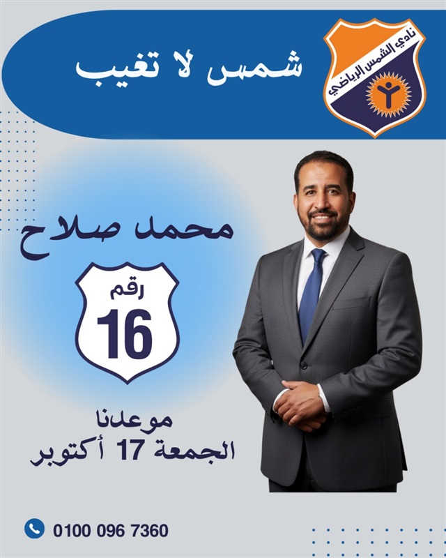 في أجواء انتخابية حماسية يشهدها نادي الشمس الرياضي استعدادًا لانتخابات مجلس الإدارة المقبلة، أعلن الكابتن محمد صلاح الشهير بـ"مو صلاح" عن ترشحه لعضوية مجلس الإدارة (الرقم 16)، كاشفًا عن برنامج انتخابي شامل يحمل رؤية طموحة لتطوير النادي وتحقيق طفرة في البنية التحتية والخدمات والأنشطة الرياضية والاجتماعية.