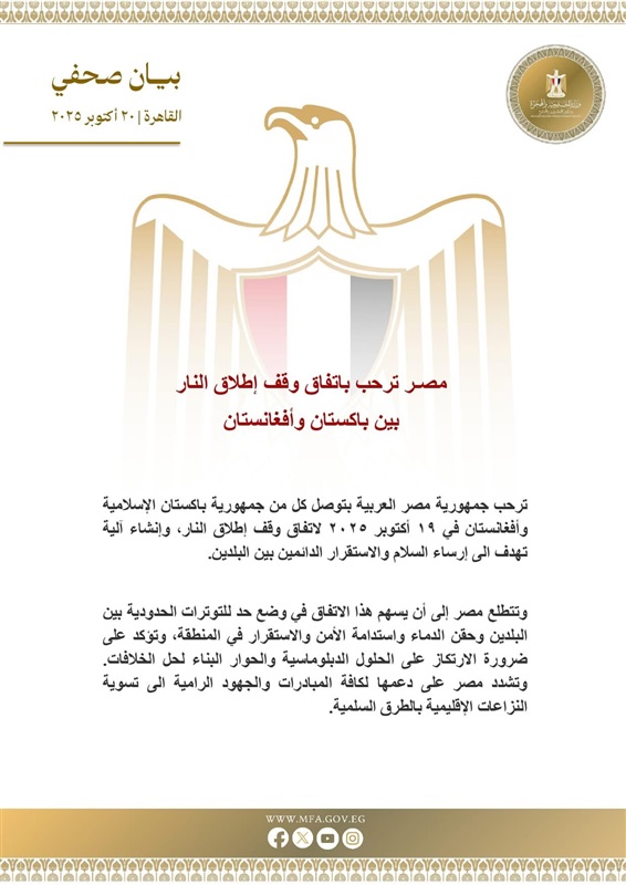 ترحب جمهورية مصر العربية بتوصل كل من جمهورية باكستان الإسلامية وأفغانستان فى ١٩ أكتوبر ٢٠٢٥ لاتفاق لوقف فورى لإطلاق النار، وإنشاء آلية تهدف الى إرساء السلام والاستقرار الدائمين بين البلدين.