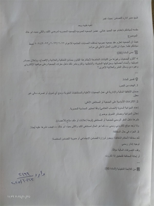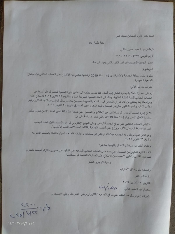 حالة من الغضب تسود بين أعضاء الجمعية العمومية للجمعية المصرية لمرضي الكبد والكلي بميت أبو خالد بمركز ميت غمر بمحافظة الدقهلية بسبب المخالفات التى يرتكبها مجلس إدارة الجمعية والتى كان أخرها الاعلان عن عقد جمعية عمومية يوم ٢٦ اكتوبر ٢٠٢٥ وذلك لمناقشة ميزانيتى عامين ٢٠٢٢/٢٠٢٣و ٢٠٢٣/٢٠٢٤ وذلك بالمخالفة للقانون .