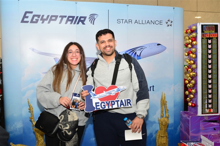 مصرللطيران تحتفل بالعام الجديد مع مسافريها في مطار القاهرة