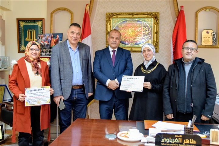 كرم الأستاذ طاهر الغرباوي مدير مديرية التربية والتعليم بمحافظة بورسعيد صباح اليوم، بمقر مكتبه بديوان المديرية، إدارة مدرسة القناة الإعدادية بنات، تقديرًا لجهودها المتميزة في استقبال وتنفيذ القوافل التعليمية لطلاب الشهادة الإعدادية، بما أسهم في دعم العملية التعليمية وتقديم خدمة تعليمية متميزة للطلاب.