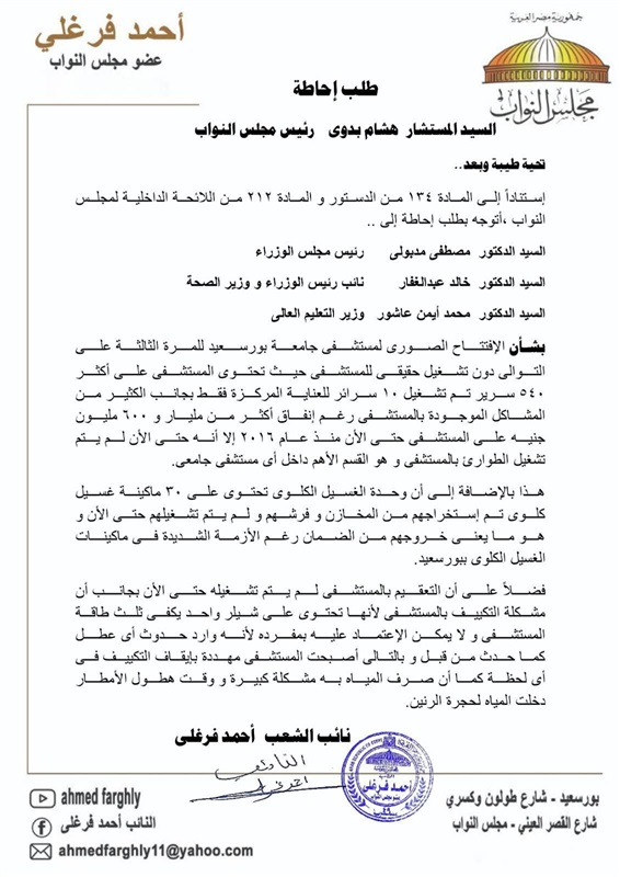 طلب إحالة عن وجود قصور في مستشفي جامعة بورسعيد