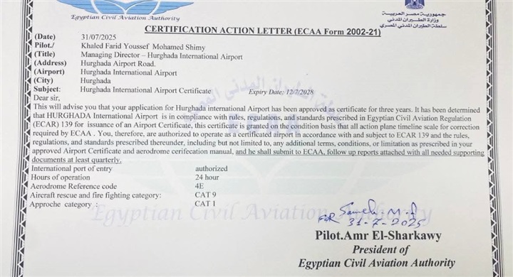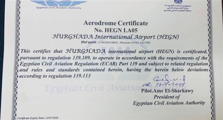 وفي السياق ذاته، تم تجديد ترخيص مطار الغردقة الدولي لمدة ثلاث سنوات، فضلًا عن تجديد تراخيص كل من مطار الأقصر الدولي ومطار سفنكس الدولي لمدة عامين خلال عام 2026، وهو ما يعكس استمرارية الالتزام بالمعايير الدولية في مختلف المطارات.