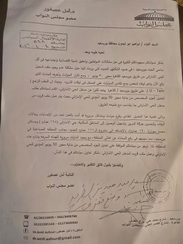 النائبة أمل عصفور تحصل على موافقة محافظ بورسعيد لإنشاء «يوترن» بمحور 30 يونيو مدخل الحي الاماراتي