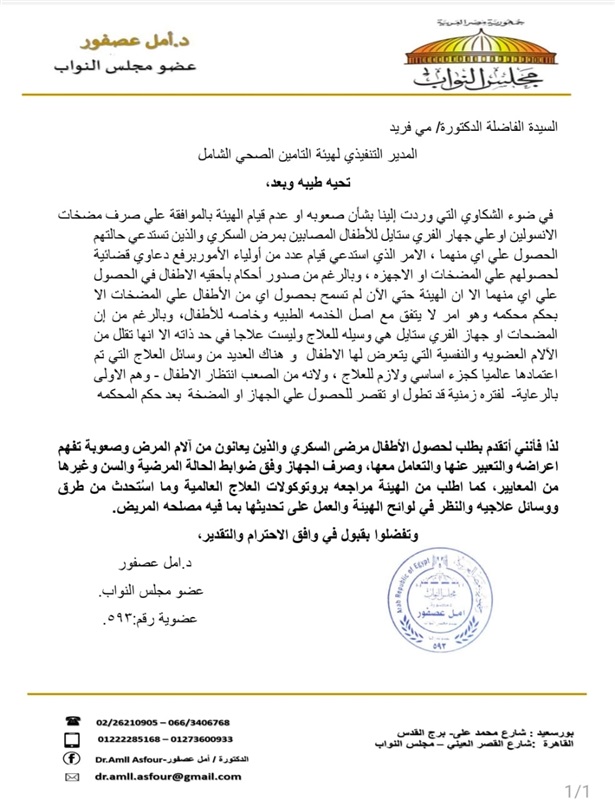وفجرت أمل عصفور في طلبها الأول أزمة حرمان الأطفال المصابين بمرض السكري من مضخات الأنسولين وأجهزة "الفري ستايل"، رغم أن حالتهم الصحية تستدعي الحصول عليها، مؤكدة أن عددًا من أولياء الأمور اضطروا للجوء إلى القضاء للحصول على حق أبنائهم في العلاج، وأن بعض الأحكام القضائية صدرت بالفعل لصالح الأطفال، إلا أن صرف المضخات ما زال متوقفا فعليا إلا بحكم محكمة.