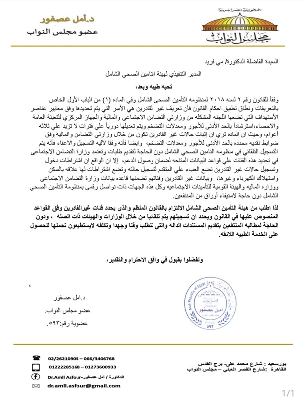 وفي الملف الثاني، فتحت النائبة ملف أزمة تسجيل غير القادرين داخل منظومة التأمين الصحي الشامل، مؤكدة أن ما يحدث على أرض الواقع يخالف نص القانون رقم 2 لسنة 2018، الذي حدد بشكل واضح أن تسجيل غير القادرين يتم تلقائيًا من خلال قواعد بيانات الدولة، دون تحميل المواطنين أعباء تقديم مستندات وإثباتات مرهقة.