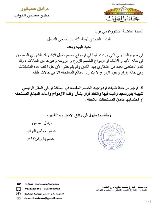 النائبة أمل عصفور تسهم في حلول أزمات التأمين الصحي الشامل ببورسعيد