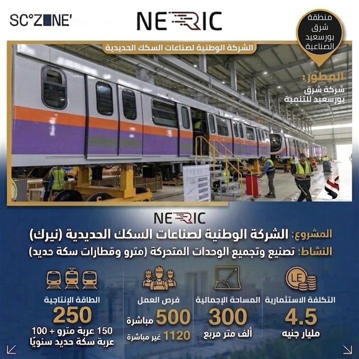 افتتح اليوم السيد الرئيس عبد الفتاح السيسي، رئيس جمهورية مصر العربية، خلال احتفالية عيد العمال، مصنع الشركة الوطنية المصرية لصناعات السكك الحديدية (نيرك - NERIC) بمنطقة شرق بورسعيد الصناعية التابعة للمنطقة الاقتصادية لقناة السويس، في خطوة تعكس اهتمام الدولة بتوطين الصناعات الاستراتيجية وتعزيز قدرات مصر الصناعية في قطاع النقل.
